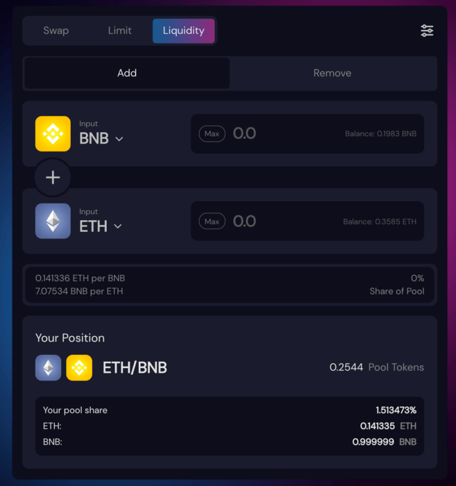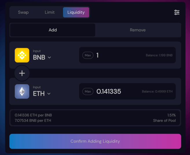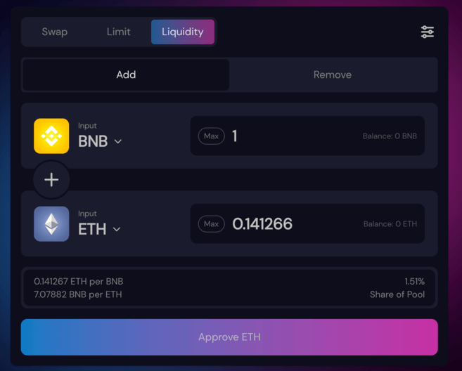 在本示例中,我们介绍如何为BNB-ETH提供流动性。当然,用户随时可以按照本示例的方法,操作其他支持在SushiSwap使用的流动性供应商代币交易对。