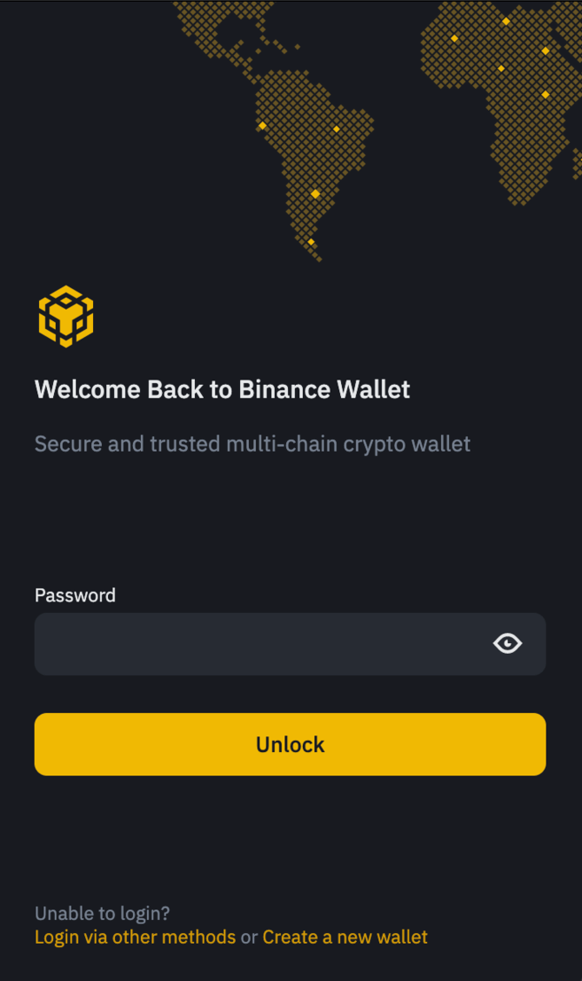 3.点击[币安]后,此处会显示弹窗。输入密码以解锁钱包。如尚未创建钱包,请点击[创建新钱包]。