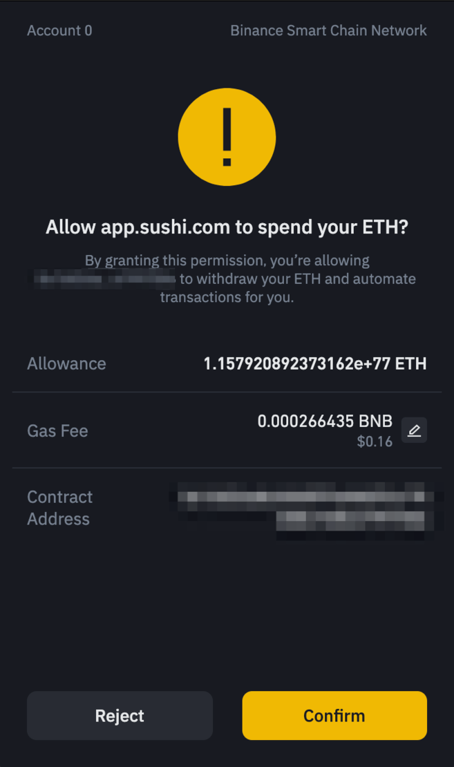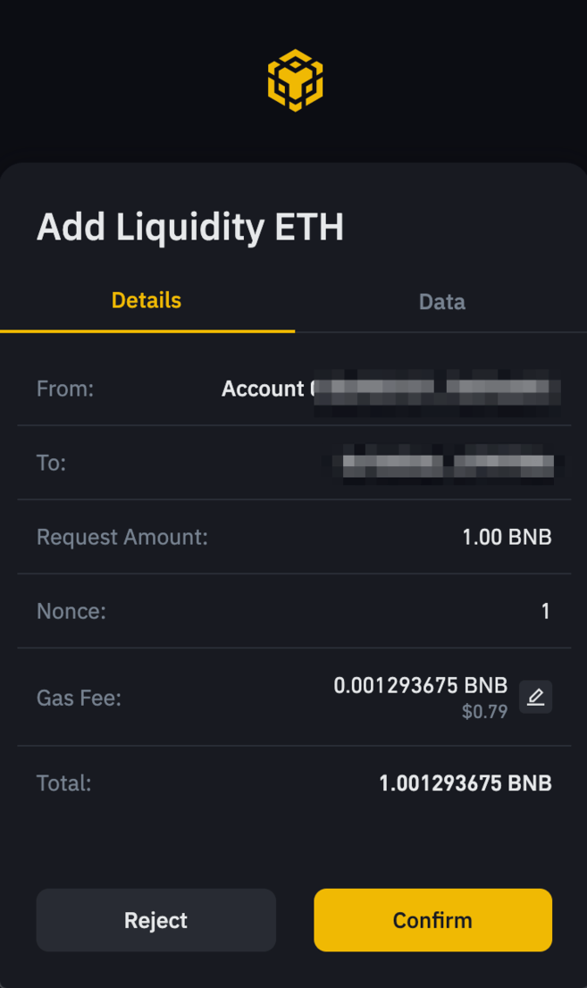 7.此时再次显示弹窗,显示内容为本次交易详情及燃料费。点击[确认]即可批准,或点击[拒绝]进行编辑。