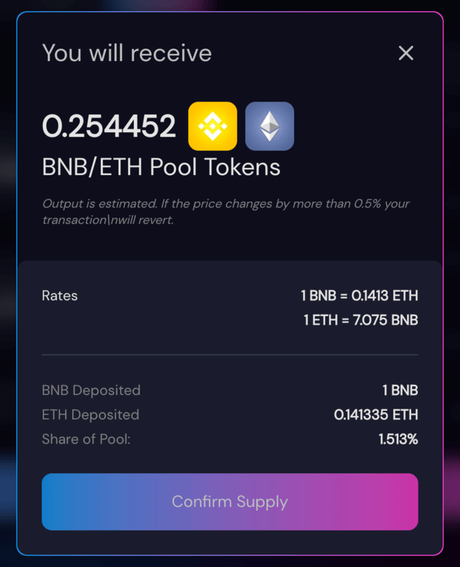 8.依次点击[确认添加流动性]和[确认供应量],即可添加流动性到BNB-ETH资金池。