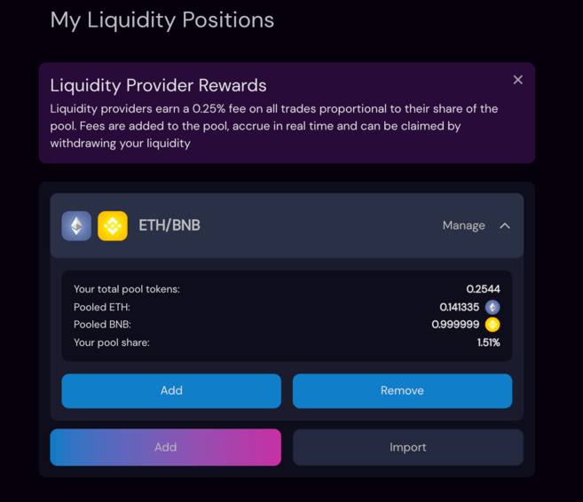 10.成功向BNB-ETH资金池添加流动性。此处将显示用户的持有仓位和在资金池所占的份额。也就是说,其他用户交易BNB/ETH时,该用户将获得交易费用奖励。