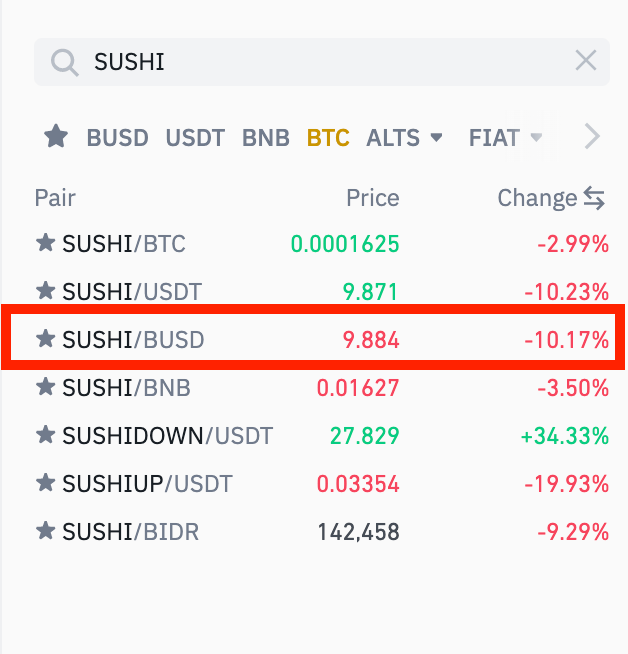 2.在屏幕右侧的搜索栏输入“SUSHI”,查看可供选择的交易对。在本例中,我们使用SUSHI/BUSD。点击[SUSHI/BUSD]以打开交易页面。