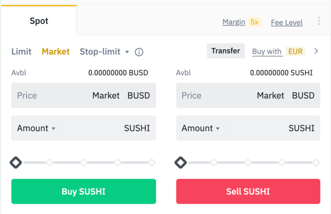 3.向下滚动至[现货]区域,即可在此处买卖SUSHI。输入希望购买或出售的SUSHI数量。然后,选择订单的订单类型。在本示例中,我们选择市价单。点击[买入SUSHI]或[卖出SUSHI],以确认订单。