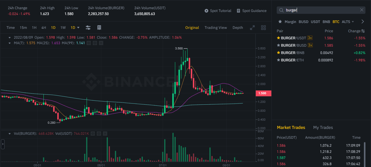 1. 您也可以交易其他加密货币,例如USDT、BUSD、BNB、ETH和BURGER。首先,进入币安交易视图,然后在显示所有可用交易对的交易对搜索栏中输入BURGER。欲知有关TradingView的更多信息,请阅读我们的指南文件如何使用币安官网的TradingView。