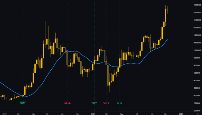我们在首次周收盘价高于20周移动平均线时买入比特币,