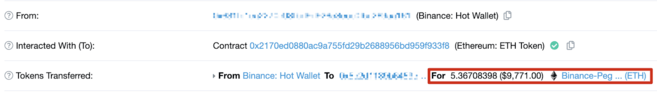在下文的示例中(来自BscScan),某位用户将以太坊(ERC-20代币)提现并选择使用其币安钱包中的币安智能链(BSC)(BEP-20代币)转账网络。此时,这些代币在币安智能链(BSC)中同一钱包地址下显示的是与币安智能链挂钩的以太坊。