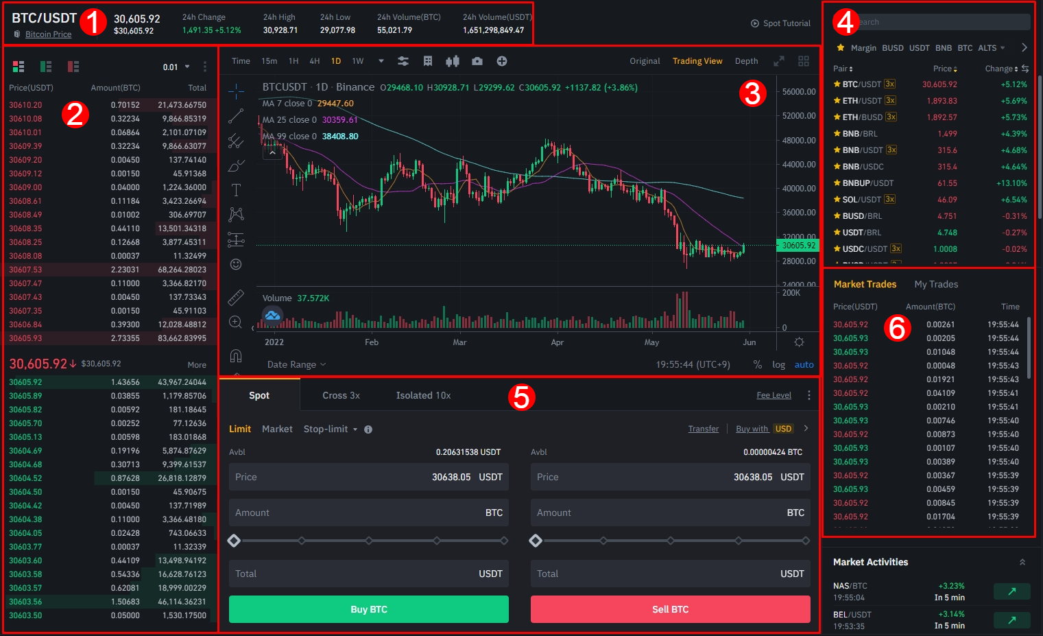 1.在顶部,您可以看到加密货币交易对和其他市场信息,如每日价格变化和交易量。
