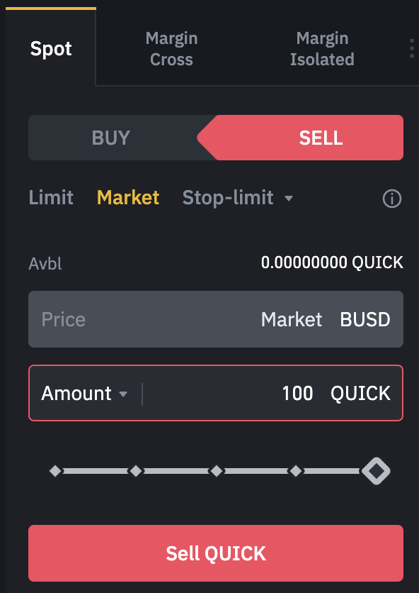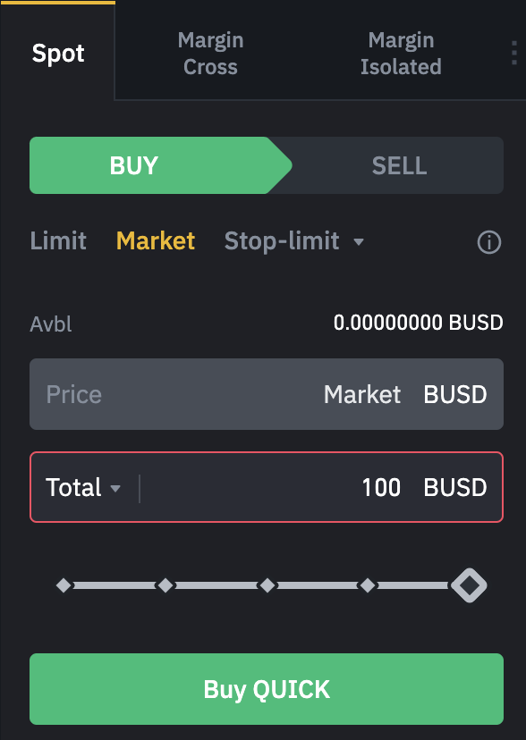 在本例子中,我们选择QUICK/BUSD。在屏幕右侧,输入希望以BUSD买入的总量。购买QUICK最快的方式是在现货市场使用市价单,以当前市价购买QUICK。