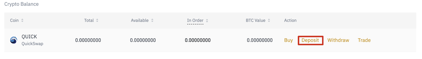 出售QUICK的步骤与上述教程的许多步骤相同。QUICK代币需要存入币安现货钱包。外部钱包中的代币首先需要转入现货钱包。访问[法币和现货]界面,点击[加密货币余额]选项卡中QUICK旁边的[充值]选项。