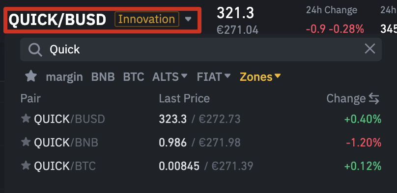 访问[经典]交易页面,在左上角选择希望交易的代币对。可以使用搜索功能缩小范围。在本例子中,我们搜索QUICK/BUSD。