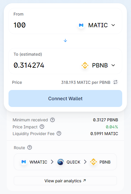 4.选择希望交换和得到的代币。在本例子中,我们以MATIC交换PBNB。