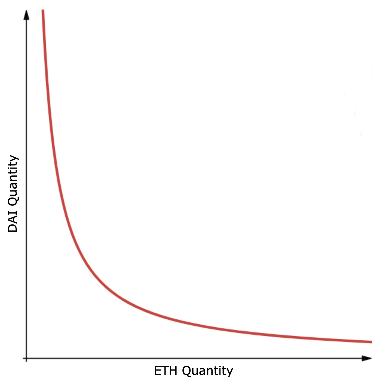我们以ETH/DAI流动性资金池为例。ETH是变量x,DAI是变量y。根据“恒定乘积做市商模型”,x与y相乘,得到恒定值k。