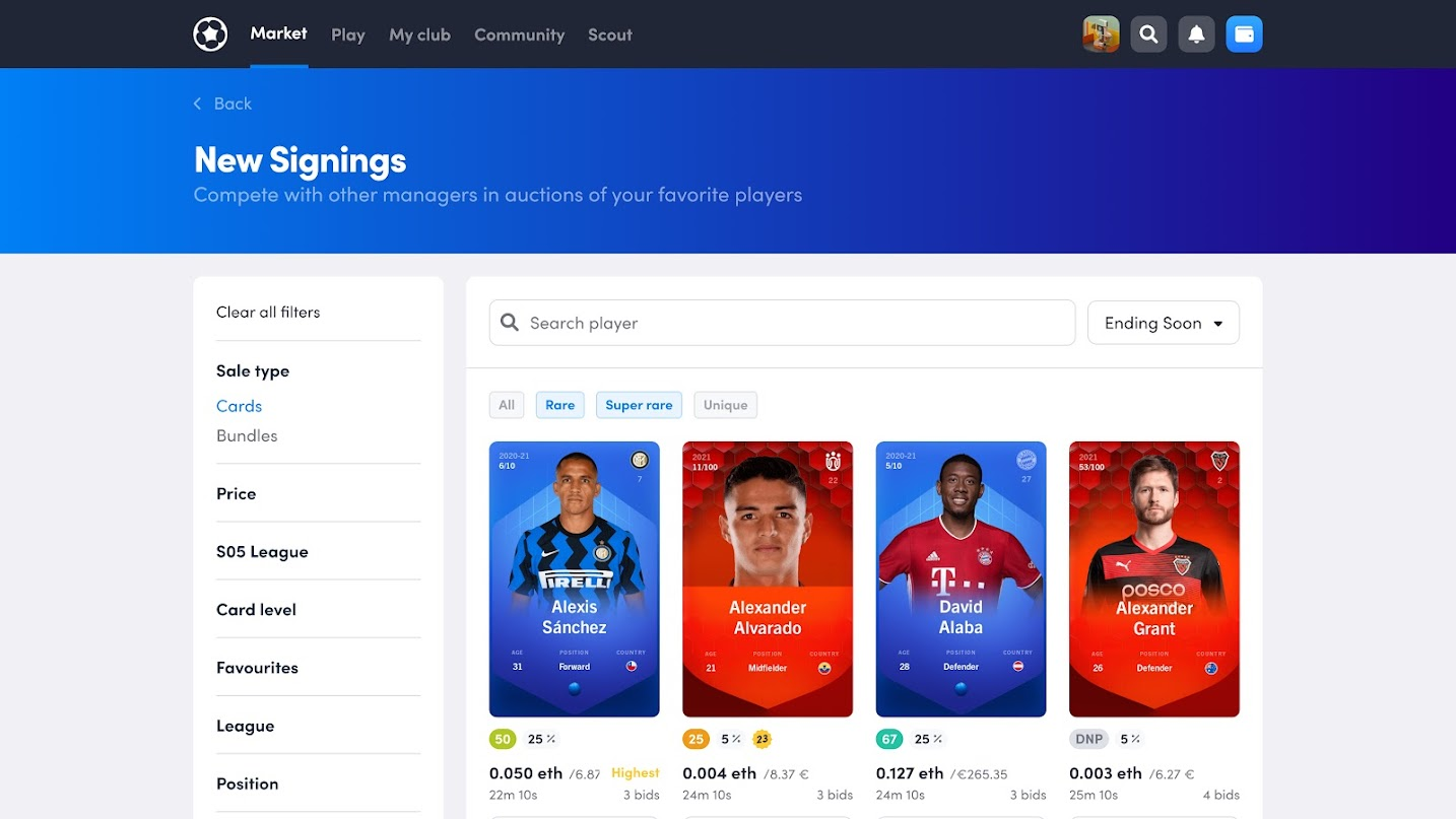 《Sorare》是一款梦幻足球游戏,玩家可以收集和交易现实中的球员。使用面向初学者的免费卡牌或购买代币化卡牌,打造一支五人明星球队。通过赢得比赛、破门得分或完成其他赛事,玩家能够赚取积分并升级。