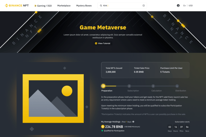 币安NFT采用申购机制来选择获奖者,让所有参与者获得平等机会,通过IGO获取NFT资产。参与者有时需要在一段时间内持有或质押购买的游戏代币或NFT,然后才能在市场中交易。
