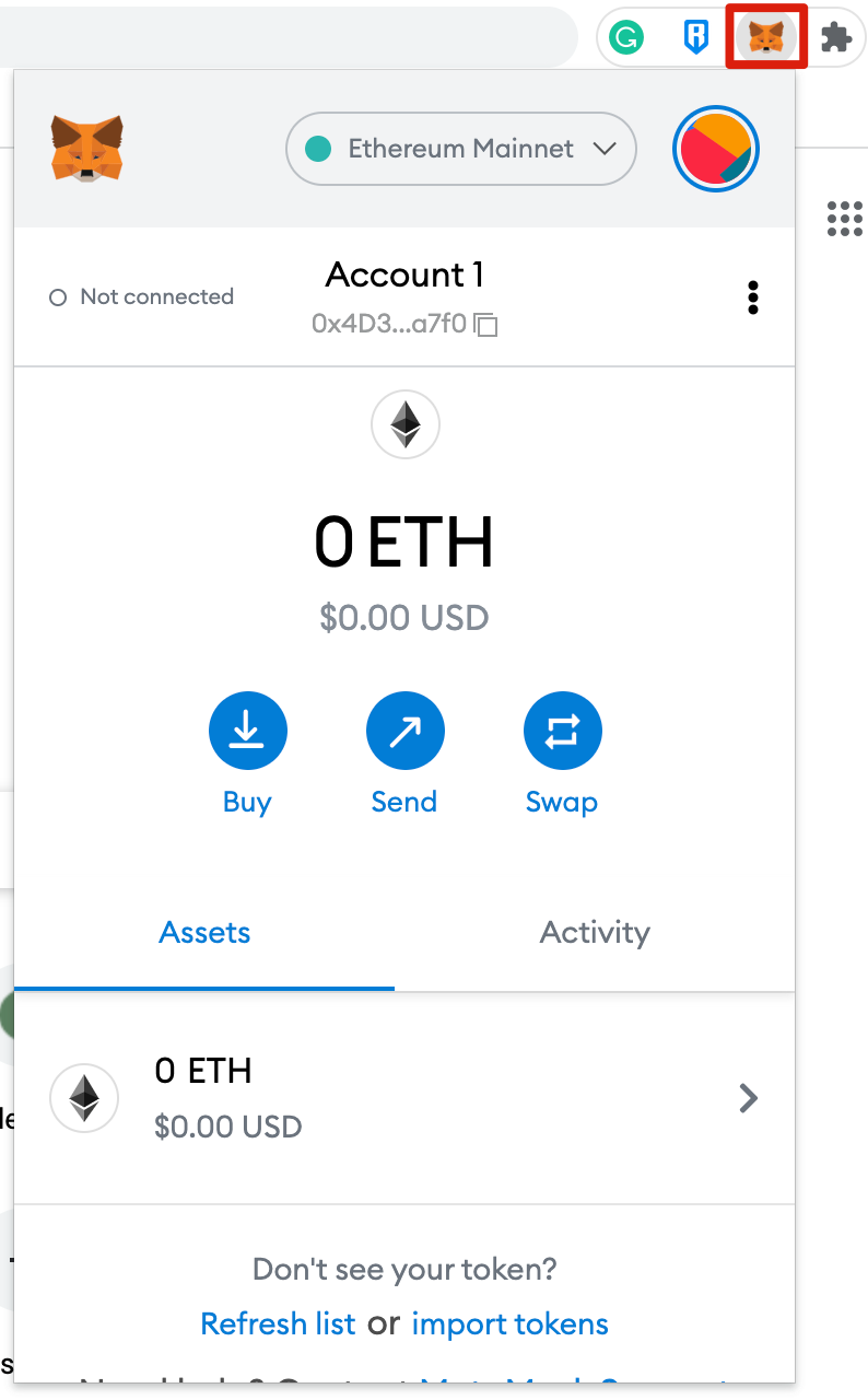 为使MetaMask易于访问,您可单击拼图图标并将MetaMask固定到工具栏,即可将其固定到Chrome浏览器中。初始设置完成后,MetaMask仅连接到以太坊。接下来,我们将看到如何将Metamask连接到Polygon。