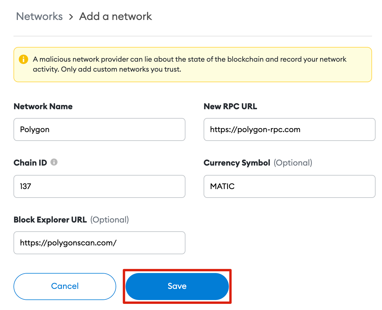 如果连接到Polygon等其他网络,您需将一些区块链基本信息添加到MetaMask。包括自定义RPC网址、链ID及网络名称。必须输入代币地址,才能添加Polygon代币。