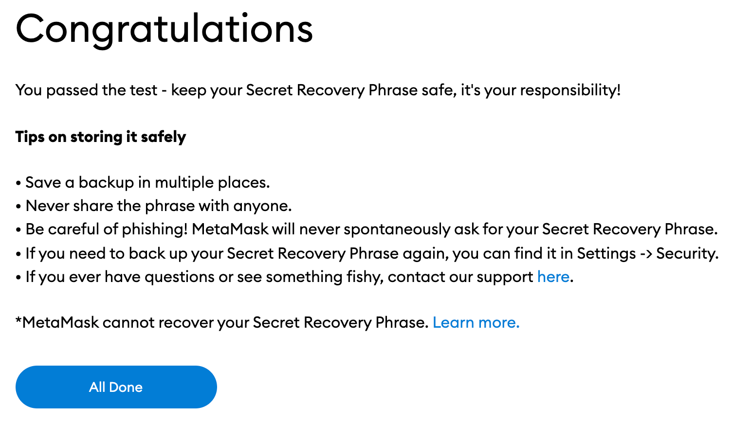 您的MetaMask钱包现已设置完毕,可以开始使用。点击[全部完成],查看您的钱包。
