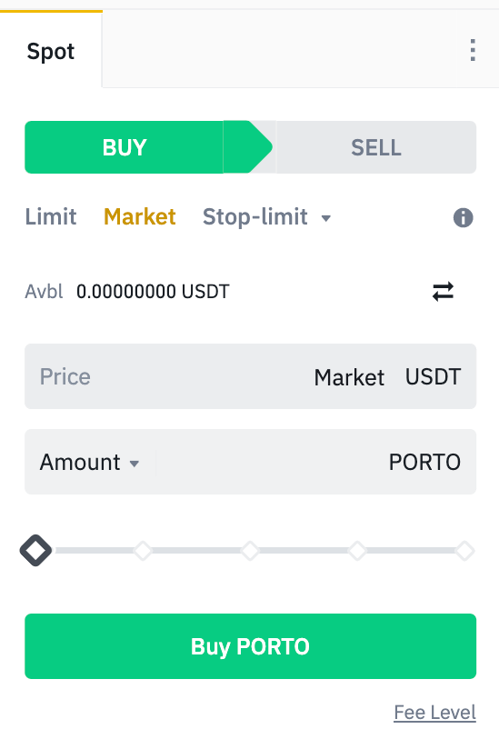 3. 前往右侧的 [现货] 框,选择您的订单类型。例如,市价单。输入您要购买的 PORTO 数量,然后点击[购买 PORTO] 即可下单。购买的 PORTO 将存入您的现货钱包。