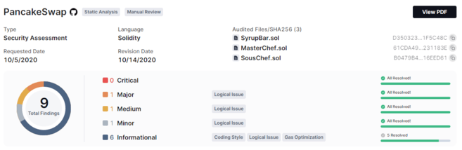 在智能合约审计方面,CertiK 是行业领导者。成百上千个项目已经通过他们对智能合约进行了审计。BSC 最大的自动化做市商 (AMM) PancakeSwap 就是其中一个例子。下面是 Certik 为 PancakeSwap 所做审计的截图。