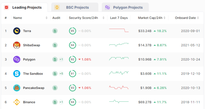 此外,币安孵化器支持的绝大多数项目都通过 CertiK 对合约进行了审计。CertiK 发布了一个审计项目排行榜,并附有安全评分,您可以对每个项目进行比较。请注意,除了以太坊,CertiK 还承接 BSC 和 Polygon 项目。