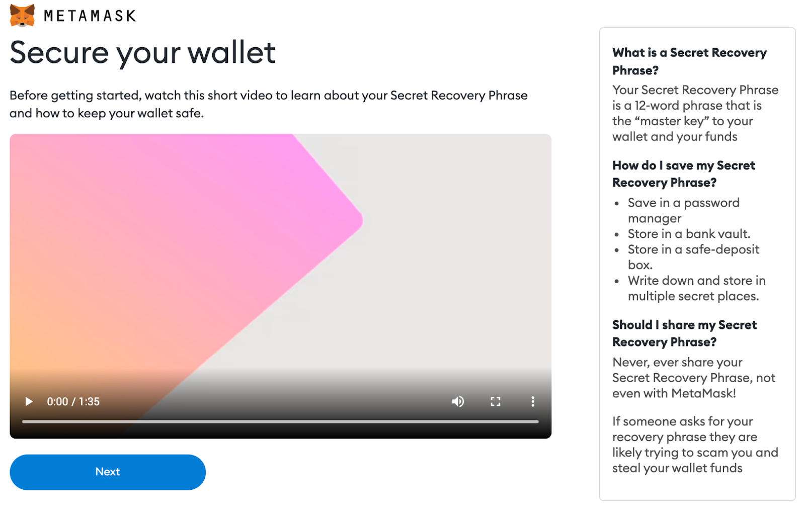 6.选择密码后,MetaMask会向您提供一些有关钱包助记词的有用信息。如果不熟悉加密货币钱包工作原理,请仔细通读本文。