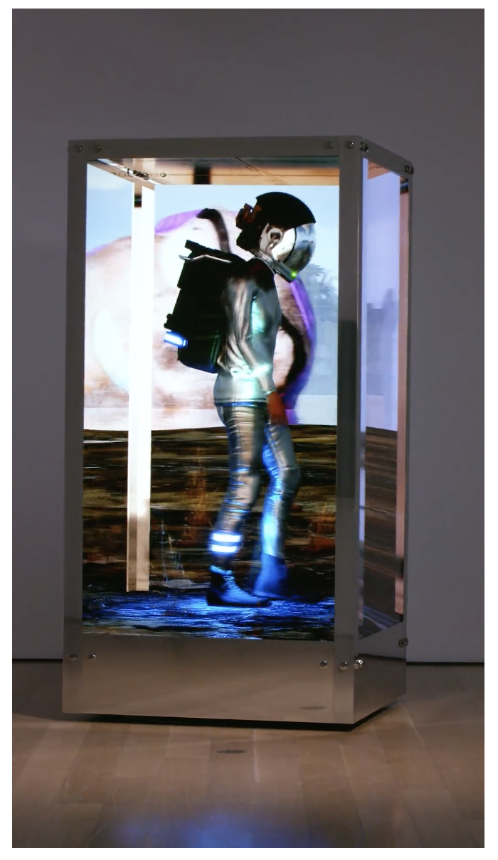 《HUMAN ONE》是一款3D移动雕塑,带有4个数字屏幕。它展示了数不清的视频影像,记录一位宇航员在一天中的不同时段穿越各个地区。这件混合艺术作品反映了Beeple超越数字领域的艺术抱负。
