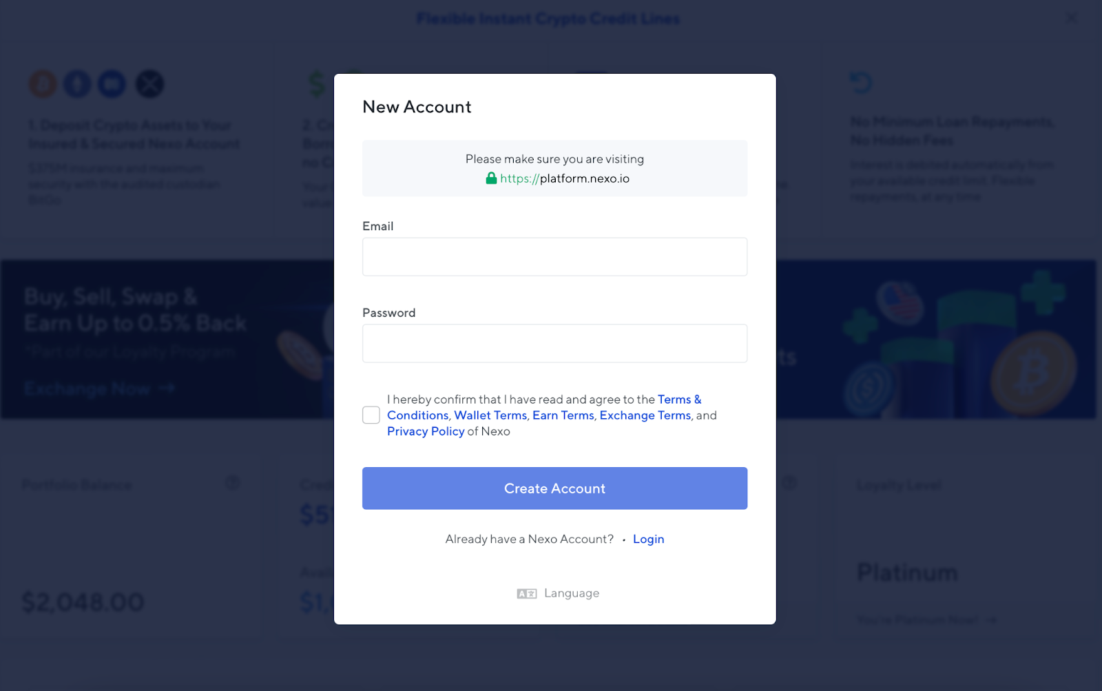 您将进入Nexo平台,您需要在这里输入您的邮箱地址和密码。验证后,您需要填写账户详细资料,并完成简短的身份验证流程。