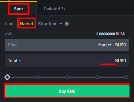 3.进入【现货】框,输入您想要购买的KNC数量。在本例中,我们选择市价单。点击【购买KNC】确认您的订单,购买的KNC将存入到您的现货钱包中。