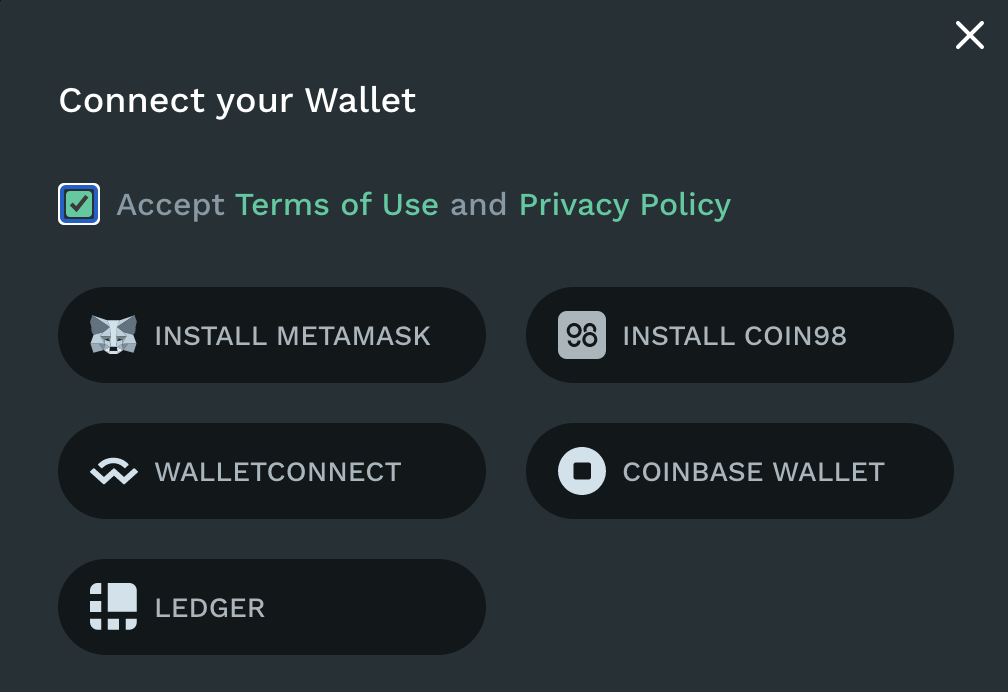 2.连接DeFi钱包。KyberSwap支持MetaMask、Coin98、WalletConnect、Coinbase Wallet和账本。