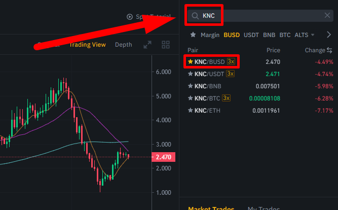 2.在搜索栏中输入“KNC”,即可查看可用的交易对。我们将以KNC/BUSD为例进行说明。