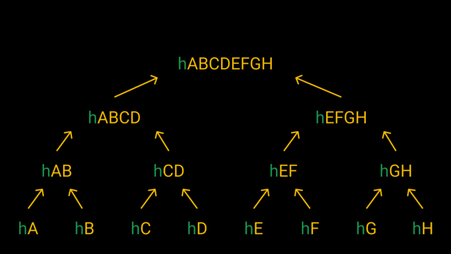 我们合并新的哈希值对再进行哈希处理,继续这个流程(见下图)。hAB与hCD哈希处理获得唯一的哈希值hABCD,hEF与hGH如法炮制得到hEFGH。最终,我们得到一个哈希值,即代表此前所有交易哈希值的哈希输出。换言之,哈希输出hABCDEFGH等于此前的所有信息。